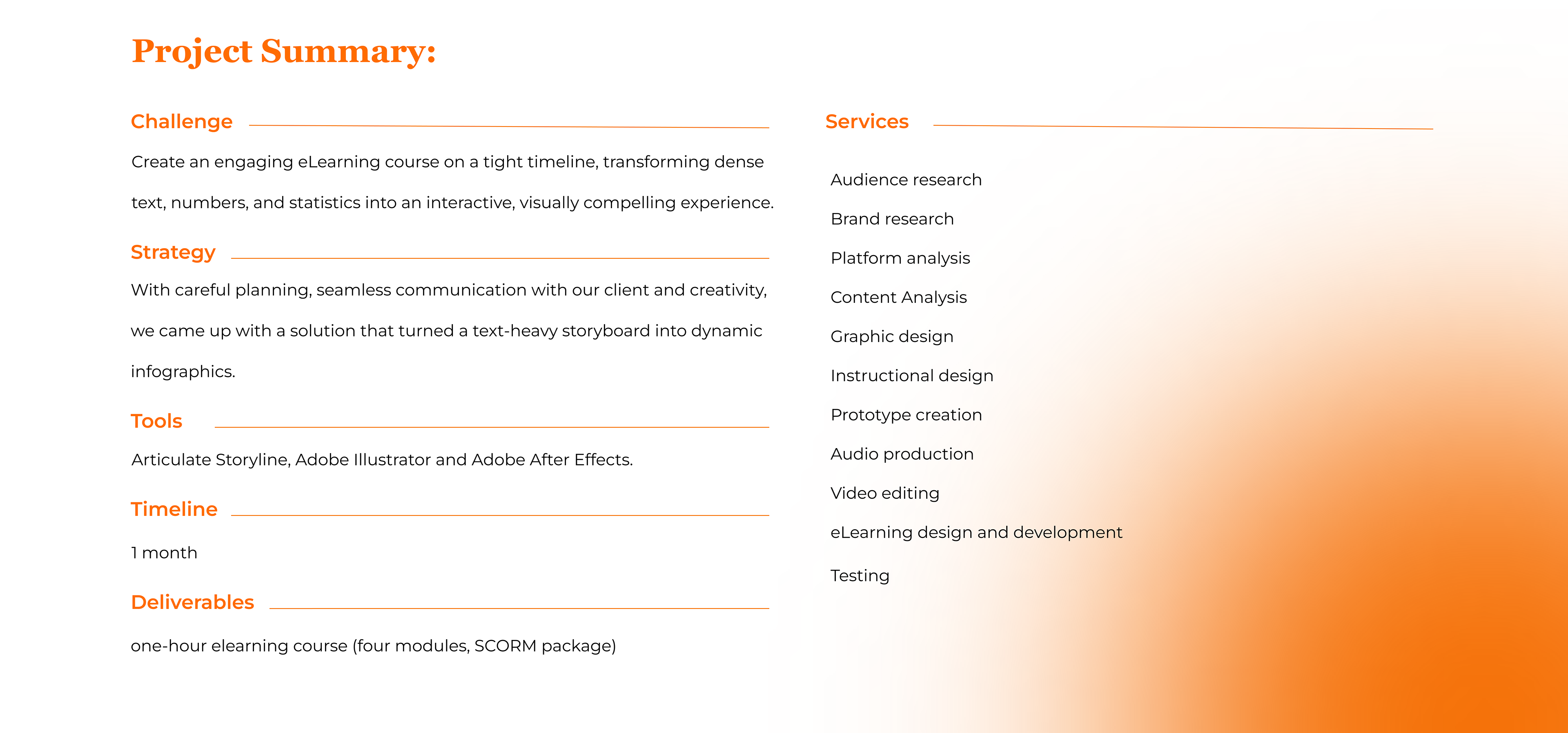 We started with a detailed analysis of the content and the organization's brand guidelines. Within the first week, we: