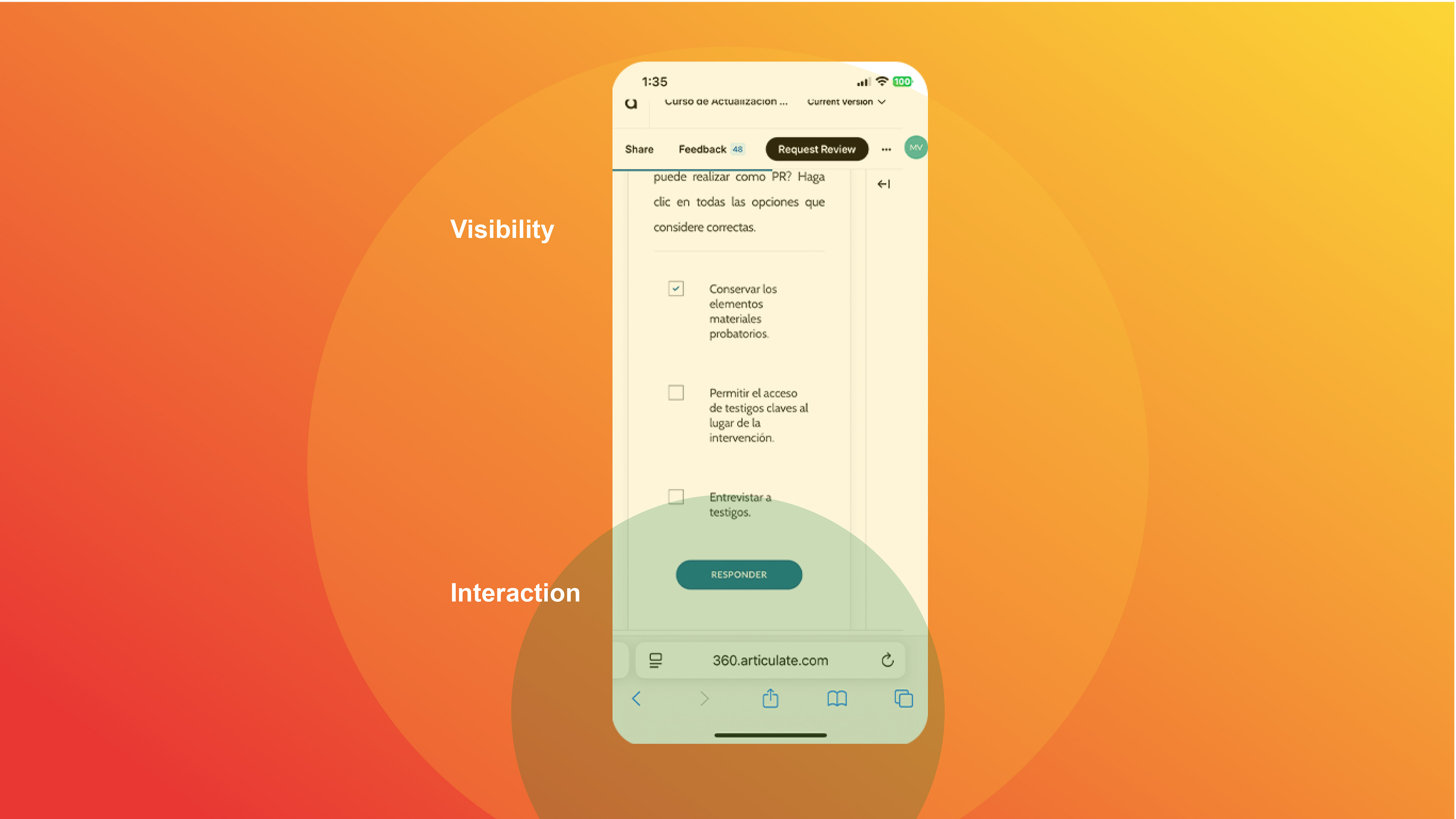 Responsive design in Articulate Rise ensures that course layouts automatically adapt to any device, with no additional coding or configuration needed. Rise uses a modular, web-based format where text, media, and interactions fluidly rearrange themselves to fit phones, tablets, and desktops. This responsive behavior makes the design inherently portable and accessible, allowing us to tailor learning experiences to each user’s context and environment. In doing so, we achieve what Ethan Marcotte describes as “a high level of continuity between different contexts” (2011:107).