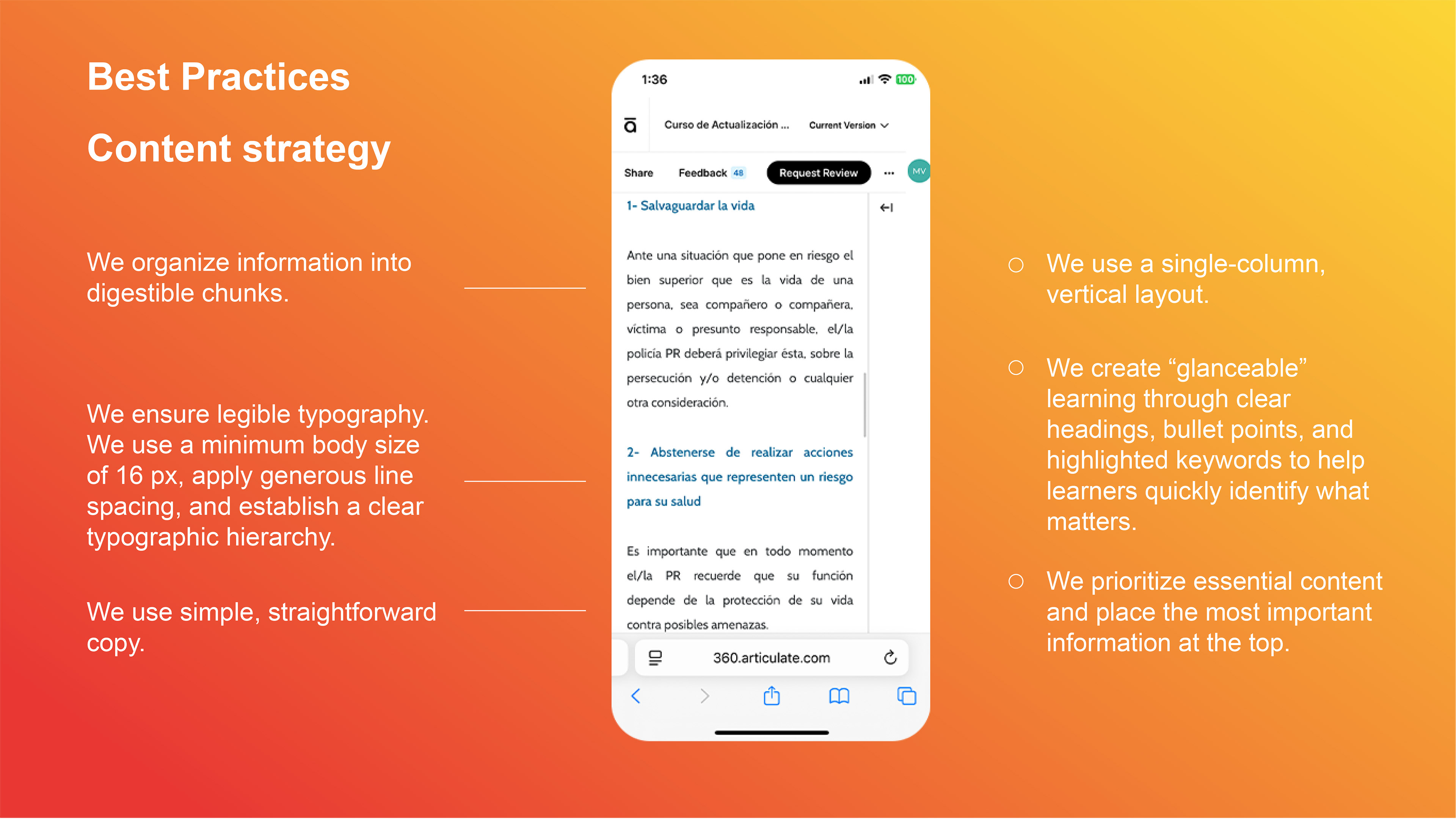 2. Conducting a Content Inventory: We reviewed all existing training materials, cataloging, evaluating, and reformatting content for a mobile-first design. Key steps included: