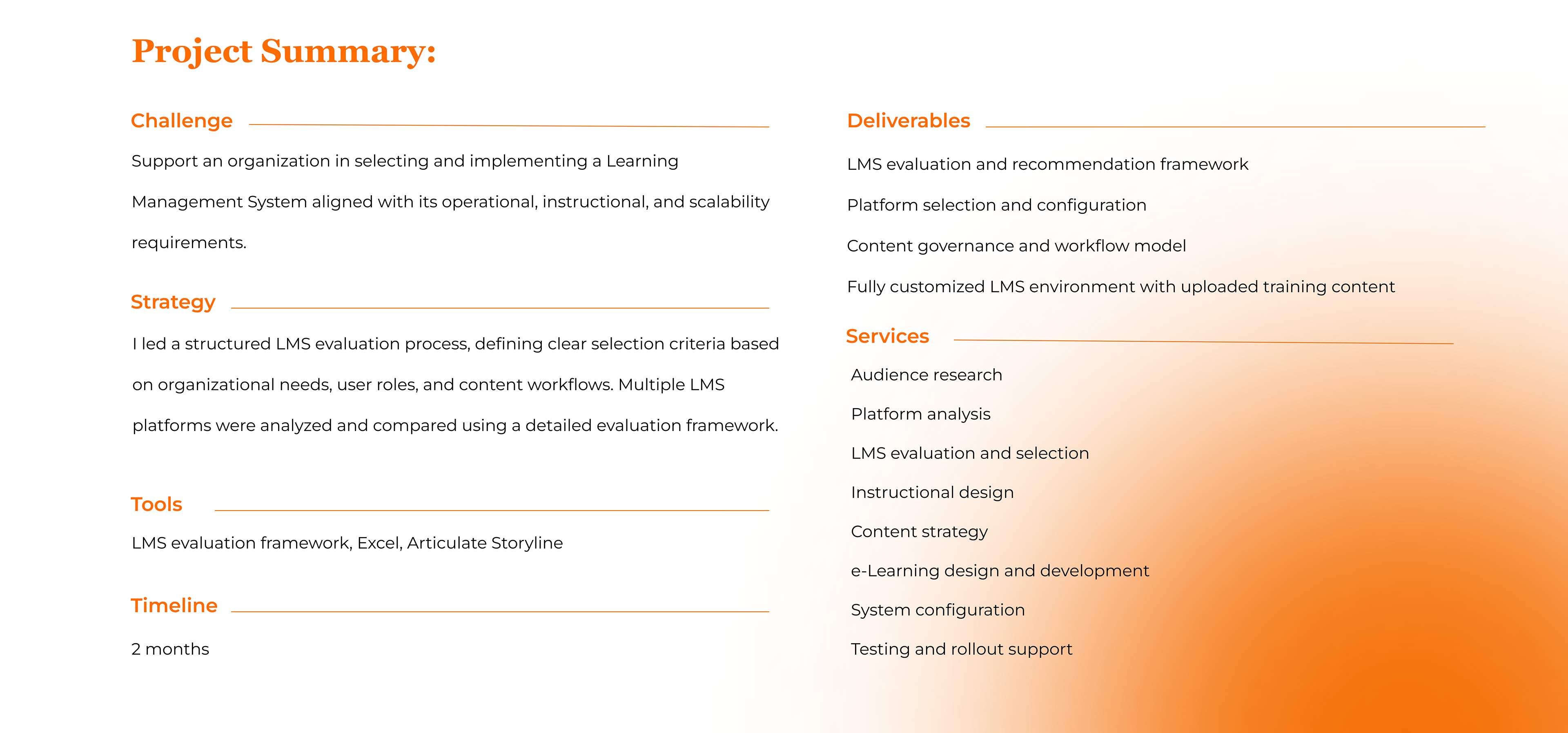I was brought in to evaluate potential LMS platforms, lead the selection process, design the training workflow, and fully implement and customize the chosen system.